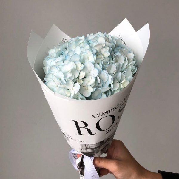 Голубая гортензия в стильной лаконичной упаковке – прекрасный комплимент для любого повода или без него.
