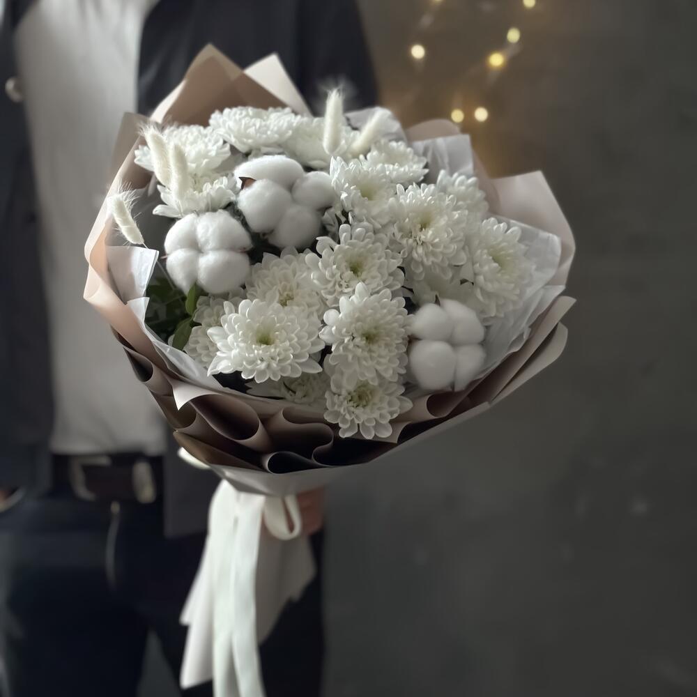🍀ZIMA! Белый букет с хризантемой и хлопком в стильной упаковке зимний в Ардатове