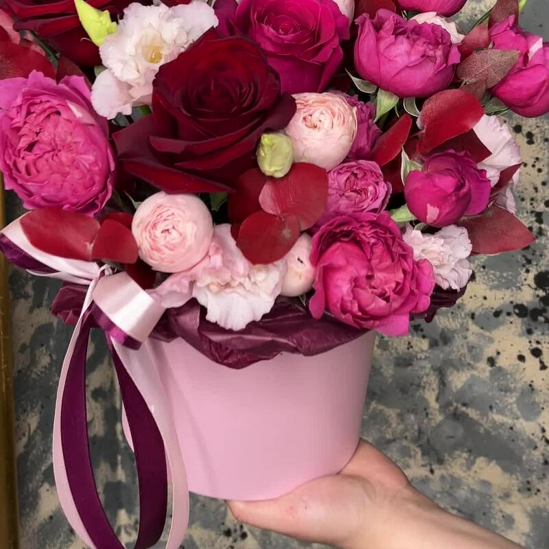 Роза Pink Floyd - 1 шт.Роза Эксплорер - 2 шт.роза пионовидная кустовая джульетта церайз - 1 шт.роза пионовидная кустовая мэнсфилд парк - 1 шт.эустома розовая - 1 шт.Эвкалипт - 2 шт.Оазис флористический - 1 шт.Коробка шляпная - 1 шт.Лента атласная - 2 шт.
